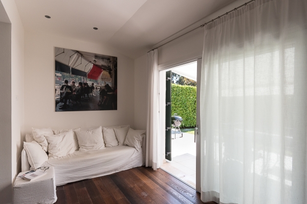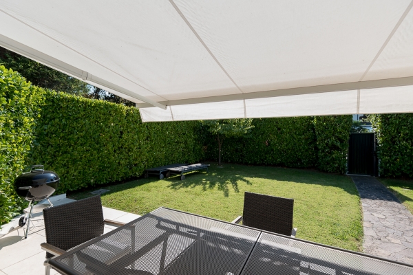 La terrazza al pianoterra viene ombreggiata da una tenda da sole bianca con sensore del vento.